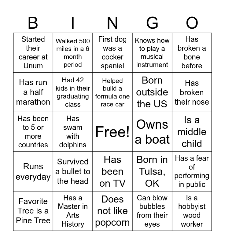 This bingo card has a free space and 35 words: Favorite Movies are Home Alone and Home Alone 2, Has a Birthday in June, Has a Birthday in December, Had 42 kids in their graduating class, Has been on TV, Knows how to play a musical instrument, Has run a half marathon, Likes Sushi, Helped build a formula one race car, Lived in 3 or more states, Has been to 5 or more countries, Has broken a bone before, Has 3 or more siblings, Was a finance major, Started their career at Unum, Owns a boat, Can blow bubbles from their eyes, Has swam with dolphins, Runs everyday, Is a hobbyist wood worker, Born in Tulsa, OK, Favorite Tree is a Pine Tree, Has a fear of performing in public, Has a Master in Arts History, First dog was a cocker spaniel, Has broken their nose, Likes floppy bacon, Birthday falls on a holiday, Born outside the US, Is a middle child, College Mascot is a fighting Okra, Does not like popcorn, Survived a bullet to the head, Walked 500 miles in a 6 month period and Favorite Character is Grinch.