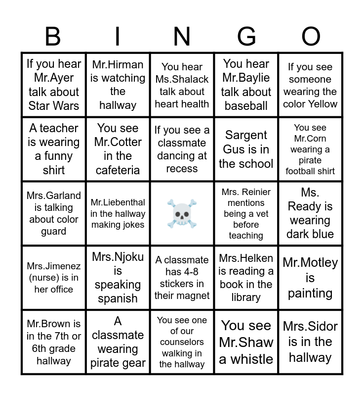 This bingo card has a free space and 24 words: Mrs.Njoku is speaking spanish, A classmate wearing pirate gear, If you see a classmate dancing at recess, Mr.Brown is in the 7th or 6th grade hallway, If you see someone wearing the color Yellow, If you hear Mr.Ayer talk about Star Wars, A teacher is wearing a funny shirt, Mr.Hirman is watching the hallway, Mrs. Reinier mentions being a vet before teaching, A classmate has 4-8 stickers in their magnet, Sargent Gus is in the school, Mrs.Garland is talking about color guard, Mrs.Helken is reading a book in the library, Mr.Motley is painting, You see Mr.Cotter in the cafeteria, You see Mr.Shaw a whistle, Ms. Ready is wearing dark blue, You hear Ms.Shalack talk about heart health, You see Mr.Corn wearing a pirate football shirt, Mr.Liebenthal in the hallway making jokes, Mrs.Sidor is in the hallway, Mrs.Jimenez (nurse) is in her office, You hear Mr.Baylie talk about baseball and You see one of our counselors walking in the hallway.