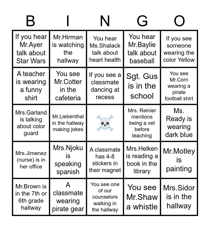 This bingo card has a free space and 24 words: Mrs.Njoku is speaking spanish, A classmate wearing pirate gear, If you see a classmate dancing at recess, Mr.Brown is in the 7th or 6th grade hallway, If you see someone wearing the color Yellow, If you hear Mr.Ayer talk about Star Wars, A teacher is wearing a funny shirt, Mr.Hirman is watching the hallway, Mrs. Reinier mentions being a vet before teaching, A classmate has 4-8 stickers in their magnet, Sgt. Gus is in the school, Mrs.Garland is talking about color guard, Mrs.Helken is reading a book in the library, Mr.Motley is painting, You see Mr.Cotter in the cafeteria, You see Mr.Shaw a whistle, Ms. Ready is wearing dark blue, You hear Ms.Shalack talk about heart health, You see Mr.Corn wearing a pirate football shirt, Mr.Liebenthal in the hallway making jokes, Mrs.Sidor is in the hallway, Mrs.Jimenez (nurse) is in her office, You hear Mr.Baylie talk about baseball and You see one of our counselors walking in the hallway.