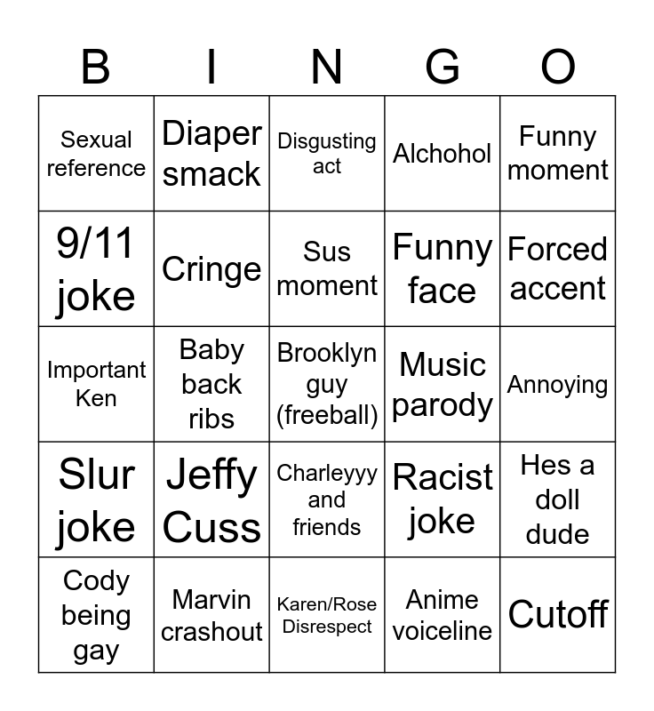 This bingo card has a free space and 24 words: Jeffy Cuss, Marvin crashout, Sus moment, Cody being gay, Funny moment, Sexual reference, 9/11 joke, Diaper smack, Music parody, Charleyyy and friends, Funny face, Important Ken, Racist joke, Hes a doll dude, Cringe, Anime voiceline, Annoying, Disgusting act, Forced accent, Baby back ribs, Cutoff, Slur joke, Alchohol and Karen/Rose Disrespect.