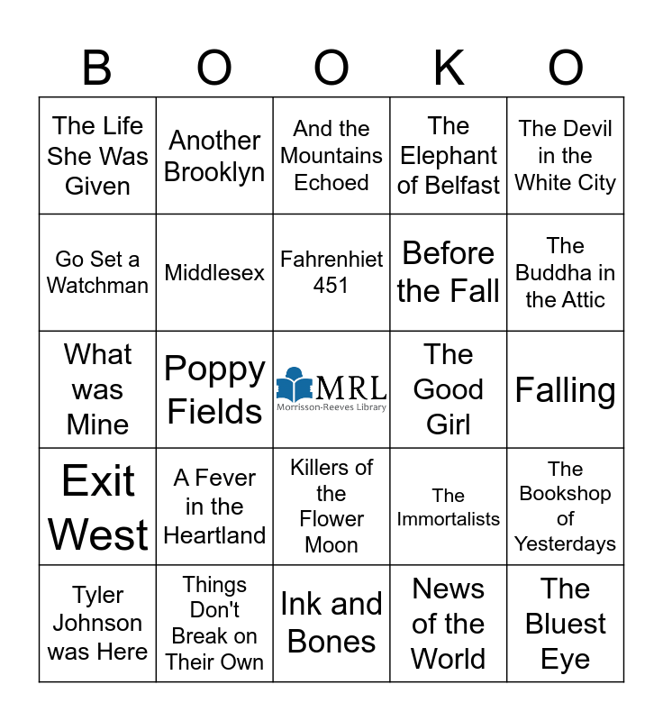 This bingo card has a free space and 112 words: All The Broken Places, Senator's Wife, The Wager, Tomorrow, Tomorrow, Tomorrow, The Stranger in the Woods, The Frozen River, The Elephant of Belfast, The Searcher, By Tana French, The Next Ship Home, Happiness Falls, All That is Mine I Carry With Me, Indigo Girl, Remarkably Bright Creature, Mercury Pictures Presents, Fever, Just a Regular Boy, Killers of the Flower Moon, Dreamland,, Stationary Shop, View From Flyover Country, Tyler Johnson was Here, And the Mountains Echoed, Redloyment, Bookshop of Yesterdays, Dreamland, Exit West, Things Don't Break on Their Own, Happy Land, The Most Fun We Ever Had, The Last Flight, The Life She Was Given, Poppy Fields, Broken Country, Atmosphere, Violin Conspiracy, Malibu Rising, The Forgetting Time, Klara and the Sun, The Children's Blizzard, The Family, The Lilac Girls, Falling, The Physick Book of Deliverance Dane, The Measure, The Good Girl, The Ways We Hide, Dear Edward, Ink and Bones, Queen Victoria, The Immortalists, World of Wonders, News of the World, Dead Wake, An American Marriage, Eleanor Oliphant, The Midnight Library, Another Brooklyn, All the Missing Girls, The Invisible Life of Addie LaRue, The Bookshop of Yesterdays, Before the Fall, The Double Bind, Winter Garden, Before We Were Yours, A Gentleman in Moscow, Eighty Days, No one is coming to Save Us, What was Mine, The Invisible Bridge, Salem Falls, The Adventures of Sherlock Holmes, The Buddha in the Attic, The Bridges of Madison County, On Juneteenth, The Fire Next Time, A Fever in the Heartland, Of Mice and Men, Tribe, 1984, The Hate U Give, The Bluest Eye, Gender Queer, Fahrenhiet 451, Middlesex, Slaughterhouse, To Kill A Mockingbird, Lady Catherine, the Earl, and the Real Downton Abbey, All Over but the Shoutin’, Back When We Were Grownups, Carry on, Jeeves, The Da Vinci Code, The Devil in the White City, Anne Frank: The Diary of a Young Girl, Digging to America, Dracula, Falling, Grapes of Wrath, The Great Gatsby, Looking for Rachel Wallace, Silence of the Lambs, The Ascent of Rum Doodle, The Last Duel, The Killer Angels, The Poisonwood Bible, The Russian Job, The Terrible Hours, Go Set a Watchman, Wine into Water, Rebecca, The Physick Book of Deliverance Dane, The Indigo Girl and The Stranger in the Woods.