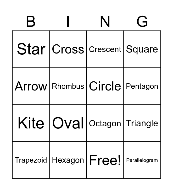 This bingo card has 17 words: Free!, Trapezoid, Crescent, Star, Oval, Square, Triangle, Circle, Pentagon, Rhombus, Hexagon, Octagon, Arrow, Cross, Kite, Heart and Parallelogram.