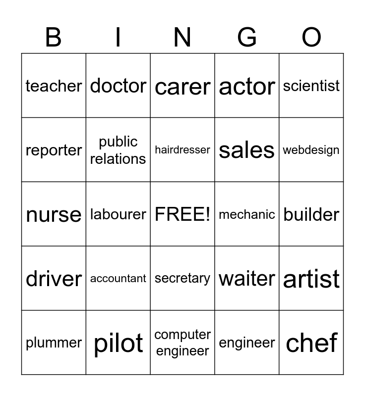This bingo card has a free space and 24 words: plummer, accountant, hairdresser, engineer, scientist, teacher, doctor, carer, mechanic, builder, nurse, public relations, waiter, artist, reporter, pilot, computer engineer, actor, webdesign, driver, labourer, secretary, sales and chef.