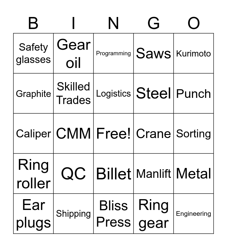 This bingo card has a free space and 60 words: Manufacturing, Shipping, Wheelabrator, Ring roller, Ring gear, Hatebur, Skilled Trades, Forklift, Steel, Pinion, Saws, Press Operators, Graphite, Forgings, AAM, Safety glasses, Engineering, Kurimoto, Safety, Logistics, Crane, Programming, Ear plugs, Metal, Mill, Lathe, Die, Slings, Punch, Shear tool, Gripper, Induction coil, Hydraulics, Cutting oil, Gear oil, Grease, Coolant, CMM, AutoCAD, Caliper, Comparator, QC, Sorting, Forge tub, Manlift, Steel Shot, HFE, Grainflow, Idler gear, Billet, Bliss Press, Clearing Press, VCI bags, Bar rack, Photo eye, Carbide, Robot, Cooling water, Compressed Air and Tonnage.