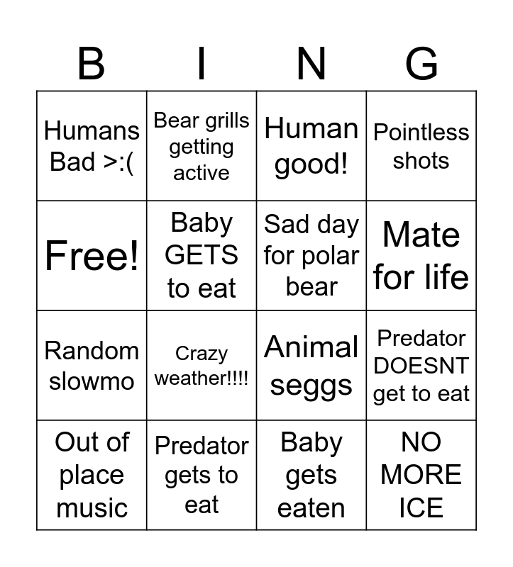 This bingo card has 16 words: Predator gets to eat, Predator DOESNT get to eat, Human good!, Humans Bad >:(, Random slowmo, Bear grills getting active, Animal seggs, Baby gets eaten, Free!, Baby GETS to eat, Out of place music, Pointless shots, Crazy weather!!!!, Mate for life, Sad day for polar bear and NO MORE ICE.