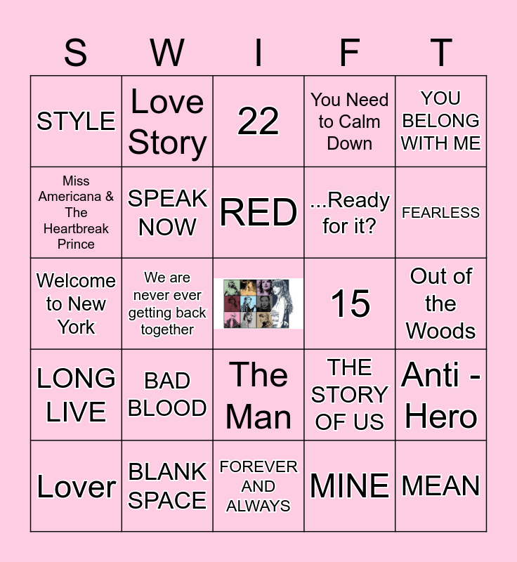 This bingo card has a free space and 29 words: SHAKE IT OFF, BLANK SPACE, 22, I KNEW YOU WERE TROUBLE, YOU BELONG WITH ME, STYLE, SPEAK NOW, RED, 15, Anti - Hero, Lover, We are never ever getting back together, MINE, MEAN, Welcome to New York, All Too Well, FOREVER AND ALWAYS, THE STORY OF US, FEARLESS, LONG LIVE, BAD BLOOD, Cruel Summer, ...Ready for it?, Out of the Woods, Miss Americana & The Heartbreak Prince, Love Story, The Man, You Need to Calm Down and Enchanted.