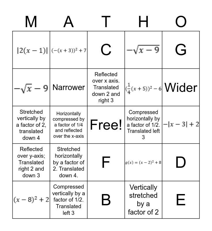This bingo card has 9 images, a free space and 18 words: A, B, C, Reflected over y-axis; Translated right 2 and down 3, Compressed horizontally by a factor of 1/2. Translated left 3, D, Stretched vertically by a factor of 2, translated down 4, Compressed vertically by a factor of 1/2. Translated left 3, Wider, Narrower, Reflected over x axis. Translated down 2 and right 3, Stretched horizontally by a factor of 2. Translated down 4., Vertically stretched by a factor of 2, Horizontally compressed by a factor of 1/4 and reflected over the x-axis, E, F, G and H.