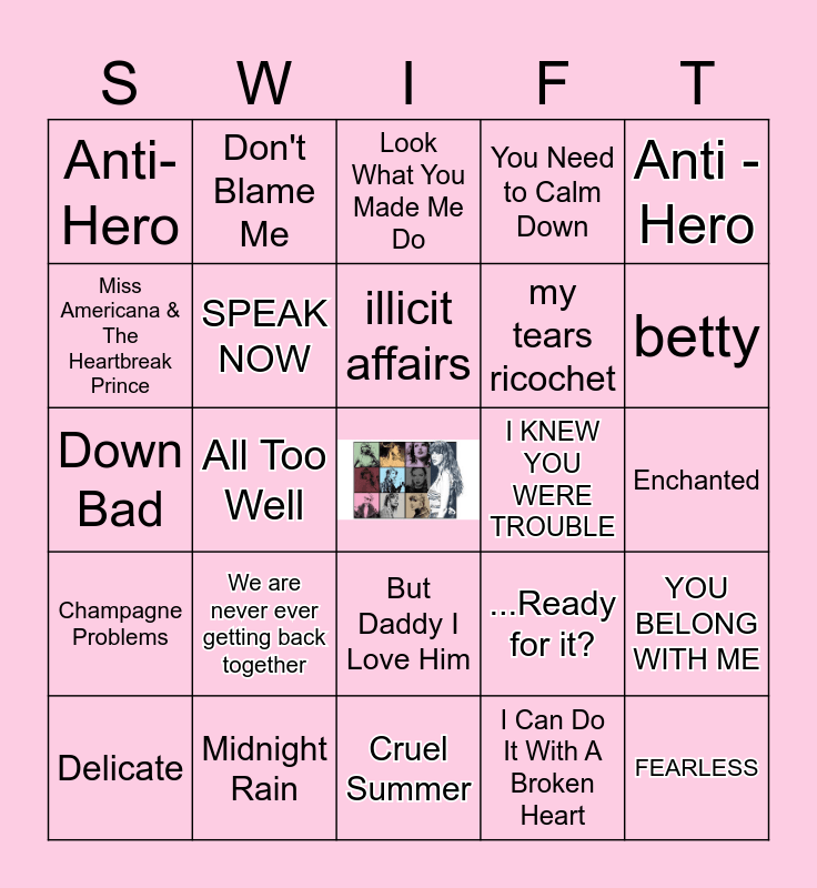 This bingo card has a free space and 46 words: SHAKE IT OFF, BLANK SPACE, 22, I KNEW YOU WERE TROUBLE, YOU BELONG WITH ME, STYLE, SPEAK NOW, RED, Anti - Hero, Lover, We are never ever getting back together, All Too Well, FEARLESS, BAD BLOOD, Cruel Summer, ...Ready for it?, Miss Americana & The Heartbreak Prince, Love Story, The Man, You Need to Calm Down, Enchanted, Delicate, Don't Blame Me, Look What You Made Me Do, Cardigan, betty, Champagne Problems, august, illicit affairs, my tears ricochet, marjorie, willow, Wildest Dreams, But Daddy I Love Him, So High School, Who's Afraid of Little Old Me?, Down Bad, Fortnight, The Smallest Man Who Ever Lived, I Can Do It With A Broken Heart, Lavender Haze, Anti-Hero, Midnight Rain, Bejewled, Mastermind and Karma.