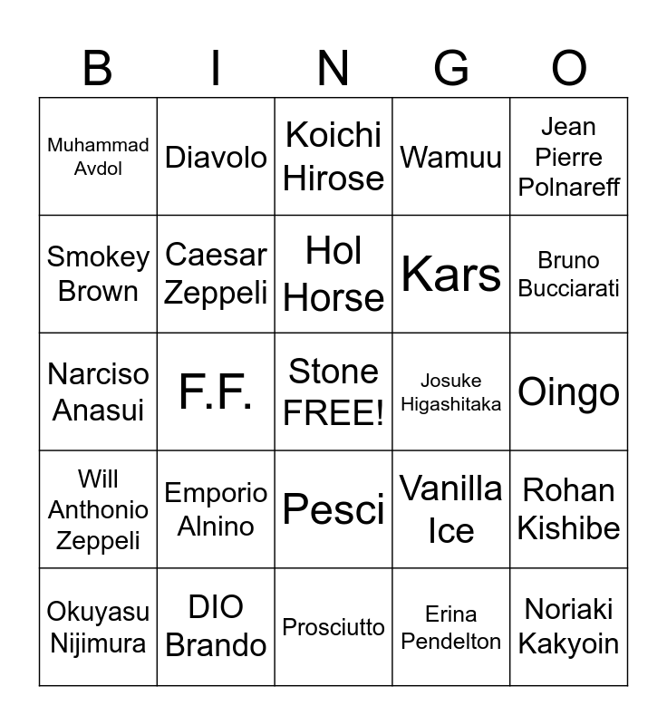 This bingo card has a free space and 59 words: Jonathan Joestar, DIO Brando, Robert E. O. Speedwagon, Will Anthonio Zeppeli, Erina Pendelton, Joseph Joestar, Caesar Zeppeli, Lisa Lisa, Kars, Esidisi, Wamuu, Santana, Smokey Brown, Suzi Q, Jotaro Kujo, Muhammad Avdol, Noriaki Kakyoin, Jean Pierre Polnareff, Iggy, Hol Horse, Josuke Higashitaka, Koichi Hirose, Okuyasu Nijimura, Rohan Kishibe, Yoshikage Kira, Mikitaka Hazekura, Anjuro (Angelo) Katagiri, Giorno Giovanna, Bruno Bucciarati, Leone Abbacchio, Guido Mista, Narancia Ghirga, Trish Una, Vinegar Doppio, Diavolo, Jolyne Cujoh, Ermes Costello, F.F., Weather Report, Narciso Anasui, Enrico Pucci, Emporio Alnino, Oingo, Boingo, Shizuka Joestar, Reimi Sugimoto, Tonio Trussardi, Risotto Nero, Pesci, Prosciutto, Johngalli A., Thunder McQueen, Sports Maxx, Yukako Yamagishi, Tomoko Higashitaka, Vanilla Ice, Mariah, Steely Dan and Tonpetty.