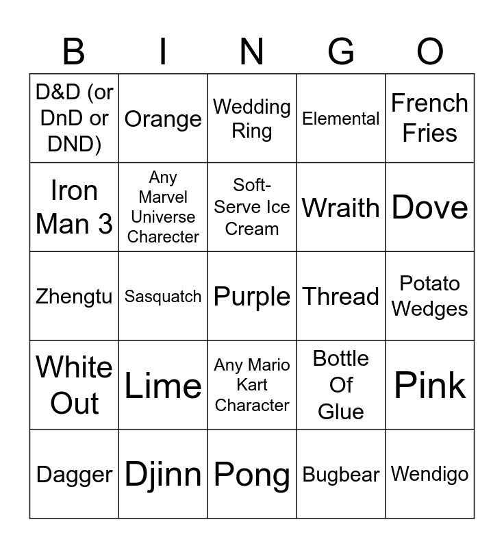 This bingo card has 25 words: Lime, Pong, Soft-Serve Ice Cream, Dagger, French Fries, D&D (or DnD or DND), Iron Man 3, Orange, Thread, Any Mario Kart Character, Wraith, Zhengtu, Bottle Of Glue, Pink, Any Marvel Universe Charecter, Wendigo, Potato Wedges, Wedding Ring, Dove, Sasquatch, Purple, Djinn, White Out, Elemental and Bugbear.