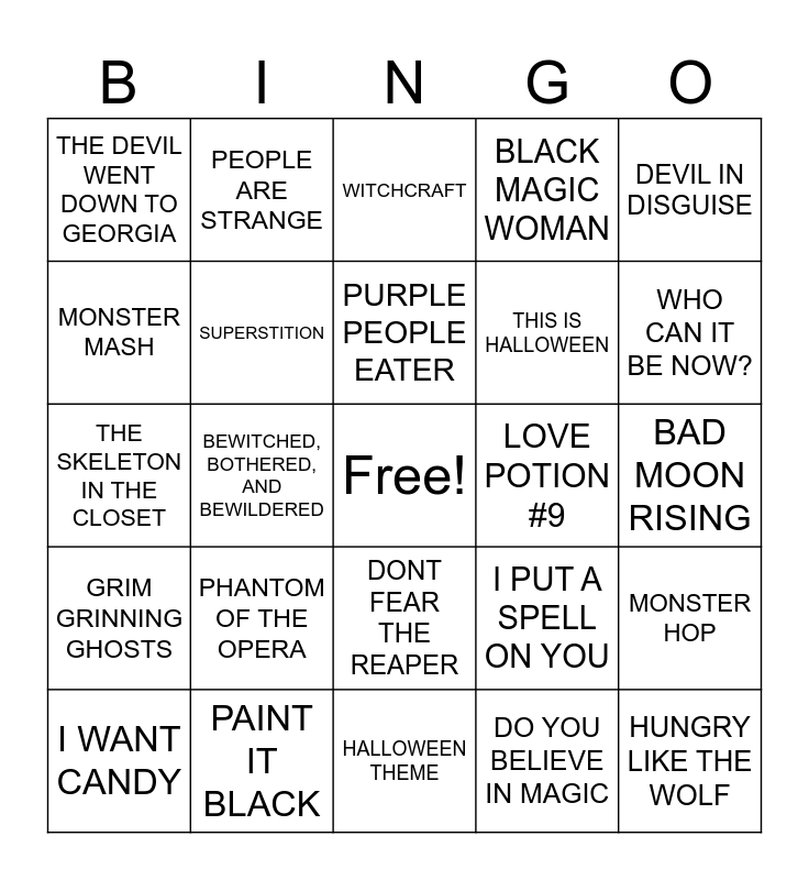 This bingo card has a free space and 44 words: PSYCHO KILLER, HUNGRY LIKE THE WOLF, MANEATER, I WANT CANDY, SOMEBODY'S WATCHING ME, DO YOU BELIEVE IN MAGIC, WITCHCRAFT, THE ADAMS FAMILY, DEVIL IN DISGUISE, PAINT IT BLACK, BLACK MAGIC WOMAN, LOVE POTION #9, DONT FEAR THE REAPER, PHANTOM OF THE OPERA, WEREWOLVES IN LONDON, HALLOWEEN THEME, TWILIGHT ZONE, THE SKELETON IN THE CLOSET, DING-DONG THE WITCH IS DEAD, WHO CAN IT BE NOW?, PEOPLE ARE STRANGE, JEEPERS CREEPERS, MAGIC DANCE, THE DEVIL WENT DOWN TO GEORGIA, LIL' RED RIDING HOOD, BAD MOON RISING, JAWS, BEETLEJUICE, I PUT A SPELL ON YOU, GRIM GRINNING GHOSTS, WITCH DOCTOR, MONSTER HOP, THE HEADLESS HORSEMAN, SEASON OF THE WITCH, BEWITCHED, BOTHERED, AND BEWILDERED, BEWICHED, THRILLER, WITCHY WOMAN, PURPLE PEOPLE EATER, MONSTER MASH, THIS IS HALLOWEEN, GHOST BUSTERS, SUPERSTITION and SPOOKY SCARY SKELETONS.