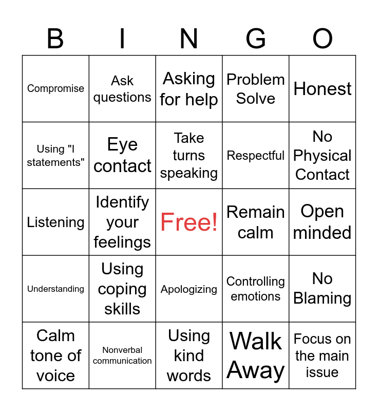 This bingo card has a free space and 24 words: Calm tone of voice, Using coping skills, Take turns speaking, Walk Away, Honest, Compromise, Ask questions, Asking for help, Remain calm, Open minded, Listening, Eye contact, Controlling emotions, No Blaming, Using "I statements", Nonverbal communication, Using kind words, Problem Solve, No Physical Contact, Understanding, Identify your feelings, Apologizing, Respectful and Focus on the main issue.