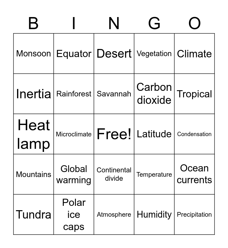 This bingo card has a free space and 24 words: Global warming, Polar ice caps, Savannah, Tundra, Climate, Monsoon, Inertia, Equator, Latitude, Continental divide, Carbon dioxide, Heat lamp, Temperature, Ocean currents, Rainforest, Humidity, Condensation, Desert, Tropical, Microclimate, Precipitation, Mountains, Vegetation and Atmosphere.