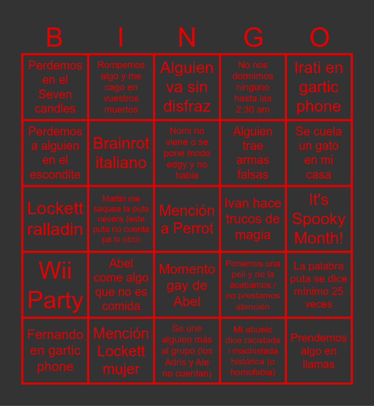 This bingo card has a free space and 24 words: Abel come algo que no es comida, Mención Lockett mujer, Nomi no viene o se pone modo edgy y no habla, Fernando en gartic phone, Irati en gartic phone, Perdemos en el Seven candles, Perdemos a alguien en el escondite, Rompemos algo y me cago en vuestros muertos, Ivan hace trucos de magia, Momento gay de Abel, Alguien trae armas falsas, Lockett ralladin, Ponemos una peli y no la acabamos / no prestamos atención, La palabra puta se dice mínimo 25 veces, Brainrot italiano, Mi abuelo dice racistada / machistada histórica (o homofobia), It's Spooky Month!, Alguien va sin disfraz, Se cuela un gato en mi casa, Martin me saquea la puta nevera (este puta no cuenta pa lo otro), Prendemos algo en llamas, Wii Party, No nos dormimos ninguno hasta las 2:30 am and Se une alguien más al grupo (los Adris y Ale no cuentan).