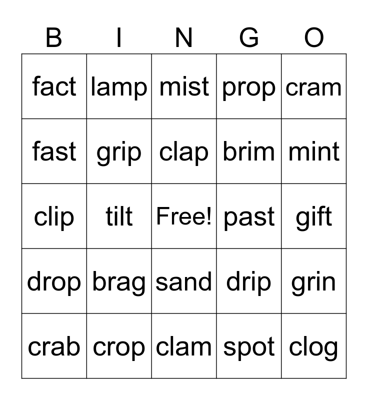 This bingo card has a free space and 25 words: brag, clam, clap, crab, cram, fact, fast, lamp, past, sand, brim, clip, drip, grin, grip, disk, gift, mist, mint, tilt, clog, crop, drop, prop and spot.