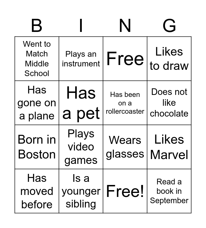 This bingo card has 17 words: Free!, Has moved before, Free, Went to Match Middle School, Plays video games, Likes to draw, Likes Marvel, Has been on a rollercoaster, Does not like chocolate, Has a pet, Is a younger sibling, Wears glasses, Has gone on a plane, Plays an instrument, Born in Boston, Favorite color in blue and Read a book in September.