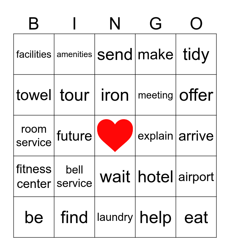 This bingo card has a free space and 44 words: provide, eat, drink, be, need, help, send, stay, tidy, find, make, explain, wait, bell service, shuttle, laundry, wake-up service, room service, luxurious, offer, amenities, king size, queen size, facilities, luggage, arrive, call, meet, hotel, fitness center, reserve, airport, vacation, will, future, check in, check out, breakfast, iron, towel, meeting, good time, tour and reception.