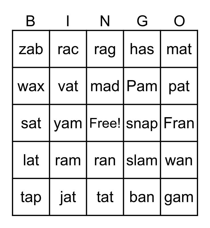 This bingo card has a free space and 24 words: ram, jat, mad, tap, mat, zab, wax, rac, snap, ran, Pam, sat, slam, wan, vat, ban, Fran, rag, pat, yam, gam, lat, has and tat.
