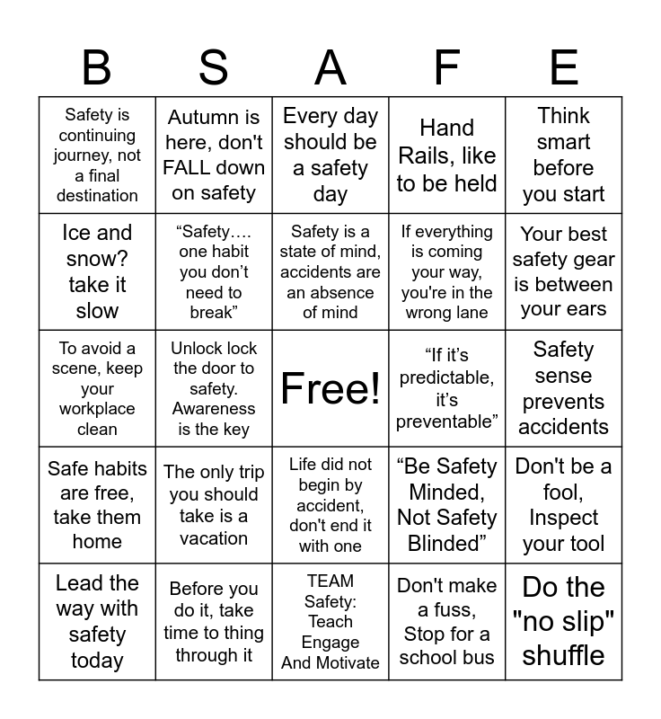 This bingo card has a free space and 24 words: Lead the way with safety today, The only trip you should take is a vacation, Safety is a state of mind, accidents are an absence of mind, Don't make a fuss, Stop for a school bus, Think smart before you start, Safety is continuing journey, not a final destination, Autumn is here, don't FALL down on safety, Every day should be a safety day, “If it’s predictable, it’s preventable”, Safety sense prevents accidents, To avoid a scene, keep your workplace clean, “Safety…. one habit you don’t need to break”, “Be Safety Minded, Not Safety Blinded”, Don't be a fool, Inspect your tool, Ice and snow? take it slow, Before you do it, take time to thing through it, TEAM Safety: Teach Engage And Motivate, Hand Rails, like to be held, Your best safety gear is between your ears, Safe habits are free, take them home, Unlock lock the door to safety. Awareness is the key, Life did not begin by accident, don't end it with one, If everything is coming your way, you're in the wrong lane and Do the "no slip" shuffle.