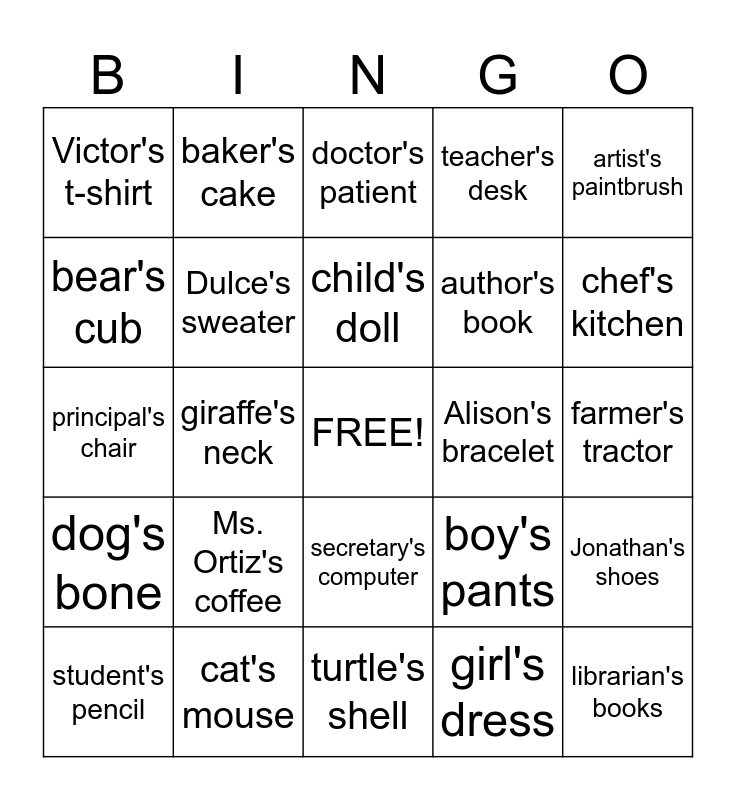 This bingo card has a free space and 24 words: Ms. Ortiz's coffee, cat's mouse, child's doll, student's pencil, artist's paintbrush, Victor's t-shirt, bear's cub, baker's cake, Alison's bracelet, secretary's computer, author's book, principal's chair, boy's pants, Jonathan's shoes, Dulce's sweater, girl's dress, farmer's tractor, doctor's patient, chef's kitchen, giraffe's neck, librarian's books, dog's bone, teacher's desk and turtle's shell.