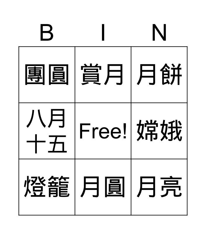 This bingo card has a free space and 8 words: 嫦娥, 月餅, 賞月, 燈籠, 團圓, 月亮, 八月十五 and 月圓.