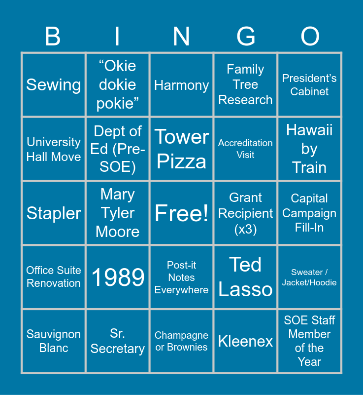 This bingo card has a free space and 24 words: 1989, Sr. Secretary, Tower Pizza, Sauvignon Blanc, President’s Cabinet, Sewing, University Hall Move, “Okie dokie pokie”, Grant Recipient (x3), Post-it Notes Everywhere, Accreditation Visit, Stapler, Ted Lasso, Sweater / Jacket/Hoodie, Dept of Ed (Pre-SOE), Kleenex, Capital Campaign Fill-In, Harmony, Hawaii by Train, Mary Tyler Moore, SOE Staff Member of the Year, Office Suite Renovation, Family Tree Research and Champagne or Brownies.