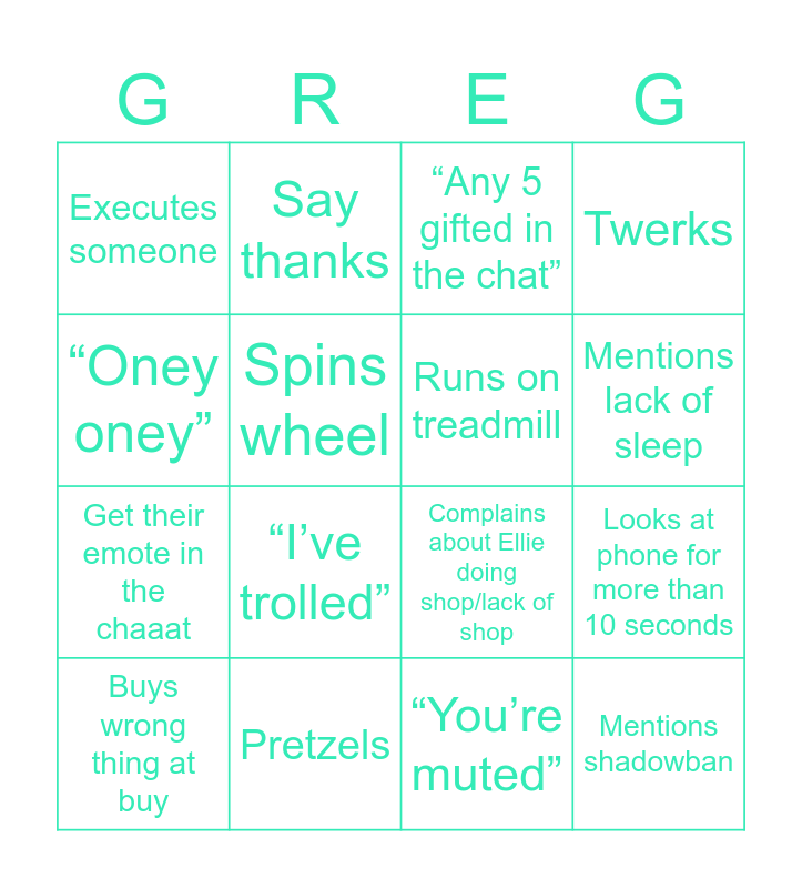 This bingo card has 44 words: “He’s Absolute”, Buys wrong thing at buy, “Sorry guys was making Ellie/brother a cuppa", !ignores Abi, Speaks Dutch, Mentions Holland, “Any 5 gifted in the chat”, Isn’t present for game starting, “Oney oney”, “Any taaaaappss”, Twerks, Pretzels, Accidental zoom, Pouts for camera effect, Mantled, Mentions eggs, Mentions Stanley, Complains about Ellie doing shop/lack of shop, Mentions rangers, “I’ve trolled”, Say thanks, “Cracked him”, “Nae audio”, Executes someone, Teabags someone, “You’re muted”, “My windows open oops” (or similar), “Wait, whaaaat?!”, Makes micro adjustment, Mentions shadowban, “He’s hacking”, Mutes to talk but doesn’t say anything, “Money's at buy”, Streeeeeeetch, Looks at phone for more than 10 seconds, Open mouth iPad kid cough, Forgets to mute, Mentions illness, Mentions lack of sleep, Spins wheel, Get their emote in the chaaat, Quotes meme (any!), Runs on treadmill and "I need to lock in".