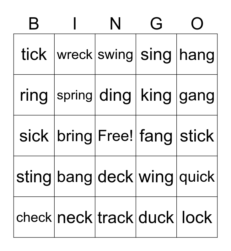 This bingo card has a free space and 24 words: bang, neck, ding, check, hang, tick, ring, wreck, fang, deck, king, sick, wing, quick, spring, duck, stick, swing, gang, bring, lock, sting, sing and track.