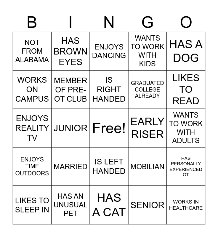 This bingo card has a free space and 24 words: LIKES TO SLEEP IN, MARRIED, IS RIGHT HANDED, SENIOR, HAS A DOG, NOT FROM ALABAMA, HAS BROWN EYES, ENJOYS DANCING, EARLY RISER, WANTS TO WORK WITH ADULTS, ENJOYS REALITY TV, MEMBER OF PRE-OT CLUB, MOBILIAN, HAS PERSONALLY EXPERIENCED OT, WORKS ON CAMPUS, HAS AN UNUSUAL PET, HAS A CAT, WANTS TO WORK WITH KIDS, LIKES TO READ, ENJOYS TIME OUTDOORS, JUNIOR, IS LEFT HANDED, GRADUATED COLLEGE ALREADY and WORKS IN HEALTHCARE.