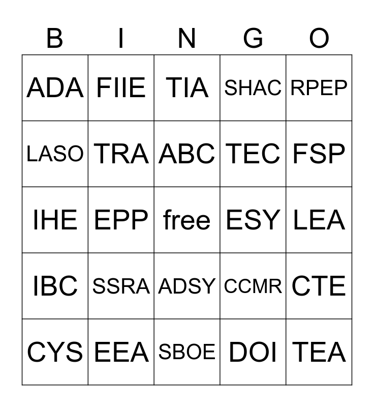 This bingo card has a free space and 29 words: CYS, GYO, EPP, PREP, ADA, TIA, TRA, SSRA, ESY, EEA, LEA, TEA, SBOE, DOI, FSP, BA, ADSY, IBC, RPEP, IHE, CCMR, ESA, TEC, LASO, SHAC, FIIE, CTE, ABC and NIFA.