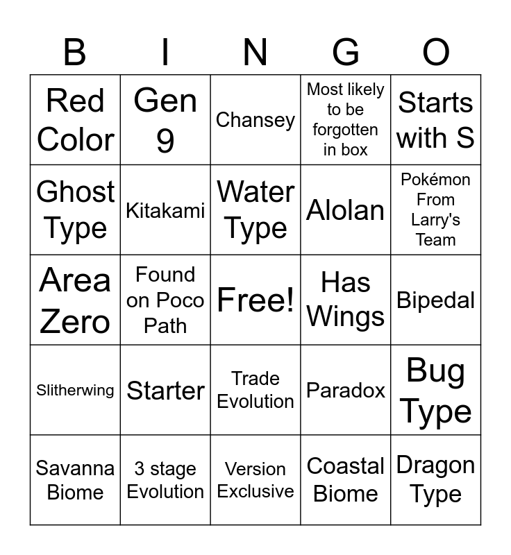 This bingo card has a free space and 24 words: Starter, 3 stage Evolution, Water Type, Savanna Biome, Starts with S, Red Color, Ghost Type, Gen 9, Has Wings, Trade Evolution, Alolan, Area Zero, Paradox, Bug Type, Kitakami, Coastal Biome, Bipedal, Chansey, Pokémon From Larry's Team, Found on Poco Path, Dragon Type, Slitherwing, Most likely to be forgotten in box and Version Exclusive.