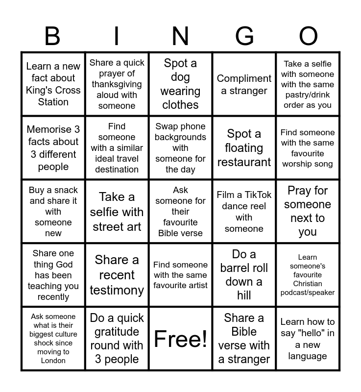 This bingo card has 31 words: Free!, Compliment someone's coffee choice, Take a selfie with street art, Wave at a stranger (they must wave back), Learn a new fact about King's Cross Station, Spot a dog wearing clothes, Find someone with a similar ideal travel destination, Do a barrel roll down a hill, Film a TikTok dance reel with someone, Share a Bible verse with a stranger, Pray for someone next to you, Ask someone for their favourite Bible verse, Learn how to say "hello" in a new language, Share how you first heard about Jesus, Find someone with the same favourite worship song, Spot a floating bookshop, Learn someone's favourite Christian podcast/speaker, Share a recent testimony, Share one thing God has been teaching you recently, Find someone with the same favourite artist, Take a selfie with someone with the same pastry/drink order as you, Share who in the Bible you'd would be good friends with, Ask someone what is their biggest culture shock since moving to London, Share a quick prayer of thanksgiving aloud with someone, Spot a floating restaurant, Memorise 3 facts about 3 different people, Compliment a stranger, Buy a snack and share it with someone new, Do a quick gratitude round with 3 people, Swap phone backgrounds with someone for the day and Share a fun fact about your hometown.