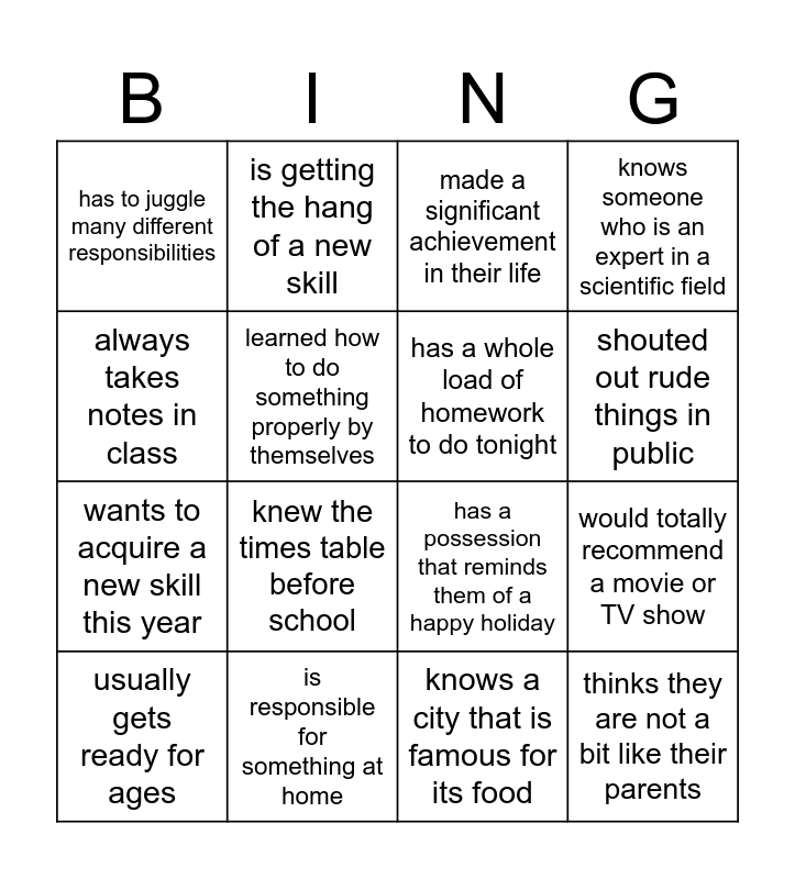 This bingo card has 16 words: is responsible for something at home, would totally recommend a movie or TV show, made a significant achievement in their life, has to juggle many different responsibilities, wants to acquire a new skill this year, is getting the hang of a new skill, has a possession that reminds them of a happy holiday, knows a city that is famous for its food, always takes notes in class, learned how to do something properly by themselves, usually gets ready for ages, knows someone who is an expert in a scientific field, knew the times table before school, shouted out rude things in public, has a whole load of homework to do tonight and thinks they are not a bit like their parents.