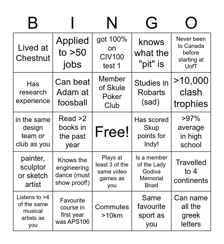 This bingo card has a free space and 24 words: Knows the engineering dance (must show proof!), Favourite course in first year was APS106, Member of Skule Poker Club, Listens to >4 of the same musical artists as you, Never been to Canada before starting at UofT, Lived at Chestnut, Has research experience, Applied to >50 jobs, Has scored Skup points for Indy!, Plays at least 3 of the same video games as you, Studies in Robarts (sad) , in the same design team or club as you, Is a member of the Lady Godiva Memorial Bnad, Travelled to 4 continents, Can beat Adam at foosball, Same favourite sport as you, >97% average in high school, got 100% on CIV100 test 1, >10,000 clash trophies, Read >2 books in the past year, Can name all the greek letters, painter, sculptor or sketch artist, knows what the "pit" is and Commutes >10km.