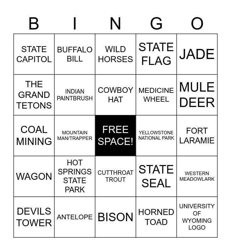 This bingo card has a free space and 24 words: HOT SPRINGS STATE PARK, ANTELOPE, COWBOY HAT, DEVILS TOWER, JADE, STATE CAPITOL, THE GRAND TETONS, BUFFALO BILL, YELLOWSTONE NATIONAL PARK, CUTTHROAT TROUT, MEDICINE WHEEL, COAL MINING, STATE SEAL, WESTERN MEADOWLARK, INDIAN PAINTBRUSH, HORNED TOAD, FORT LARAMIE, WILD HORSES, MULE DEER, MOUNTAIN MAN/TRAPPER, UNIVERSITY OF WYOMING LOGO, WAGON, STATE FLAG and BISON.