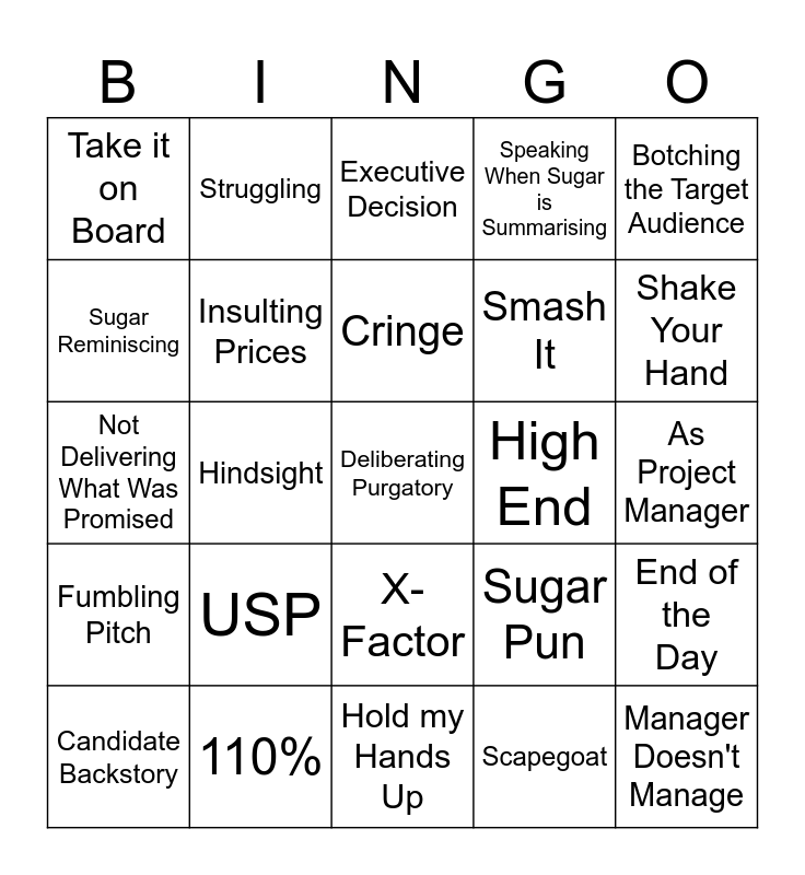 This bingo card has 25 words: USP, Hold my Hands Up, Cringe, Candidate Backstory, Botching the Target Audience, Take it on Board, Sugar Reminiscing, Struggling, High End, X-Factor, Smash It, Not Delivering What Was Promised, Sugar Pun, End of the Day, Insulting Prices, Manager Doesn't Manage, As Project Manager, Executive Decision, Shake Your Hand, Hindsight, Deliberating Purgatory, 110%, Fumbling Pitch, Speaking When Sugar is Summarising and Scapegoat.