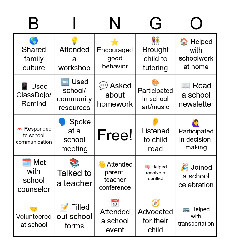 This bingo card has a free space and 25 words: ๐ Talked to a teacher, ๐ Attended a school event, ๐ฌ Asked about homework, ๐ค Volunteered at school, ๐ Helped with schoolwork at home, ๐ Shared family culture, ๐ฑ Used ClassDojo/ Remind, ๐ก Attended a workshop, ๐ Listened to child read, ๐ Attended parent-teacher conference, ๐จ Participated in school art/music, ๐ Responded to school communication, ๐ง Helped resolve a conflict, ๐ Joined a school celebration, ๐ Used school/ community resources, ๐งบ Sent supplies or snacks, ๐โโ๏ธ Participated in decision-making, โญ Encouraged good behavior, ๐ Read a school newsletter, ๐ฃ๏ธ Spoke at a school meeting, ๐ Helped with transportation, ๐ Filled out school forms, ๐๏ธ Met with school counselor, ๐ซ Brought child to tutoring and ๐งญ Advocated for their child.