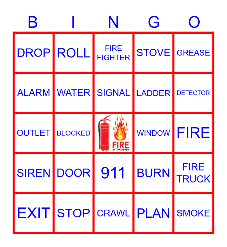 This bingo card has a free space and 26 words: 911, PLAN, SIGNAL, STOP, GREASE, DROP, ALARM, ROLL, FIRE, BURN, LADDER, OUTLET, FIRE TRUCK, EXIT, BLOCKED, EXTINGUISHER, STOVE, SIREN, FIRE FIGHTER, SMOKE, DETECTOR, CRAWL, WINDOW, DOOR, WATER and EMEREGENCY.
