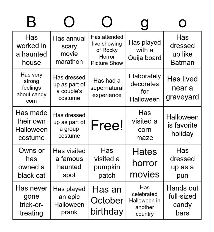 This bingo card has a free space and 24 words: Has visited a famous haunted spot, Has played an epic Halloween prank, Has had a supernatural experience, Has never gone trick-or-treating, Has dressed up like Batman, Has worked in a haunted house, Has very strong feelings about candy corn, Has annual scary movie marathon, Has visited a corn maze, Has visited a pumpkin patch, Elaborately decorates for Halloween, Has made their own Halloween costume, Hates horror movies, Has dressed up as a pun, Has dressed up as part of a couple's costume, Has celebrated Halloween in another country, Halloween is favorite holiday, Has attended live showing of Rocky Horror Picture Show, Has lived near a graveyard, Has dressed up as part of a group costume, Hands out full-sized candy bars, Owns or has owned a black cat, Has played with a Ouija board and Has an October birthday.