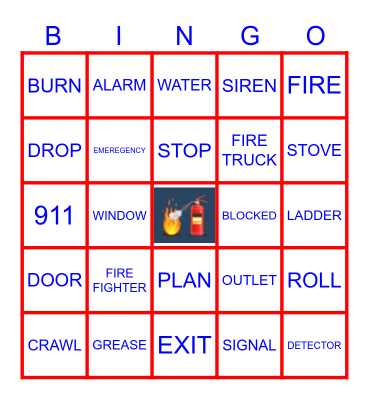 This bingo card has a free space and 26 words: PLAN, SIGNAL, STOP, GREASE, FIRE, BURN, DROP, ALARM, LADDER, OUTLET, FIRE TRUCK, 911, ROLL, CRAWL, WINDOW, SMOKE, SIREN, DOOR, WATER, DETECTOR, STOVE, EXIT, BLOCKED, FIRE FIGHTER, EMEREGENCY and EXTINGUISHER.