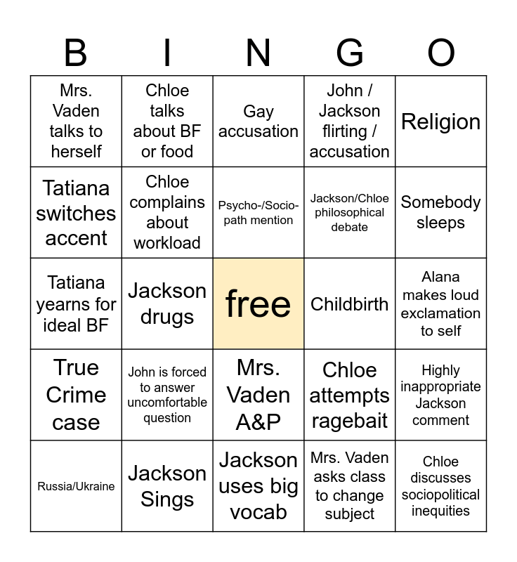 This bingo card has a free space and 24 words: John is forced to answer uncomfortable question, Jackson Sings, Psycho-/Socio- path mention, Russia/Ukraine, Religion, Mrs. Vaden talks to herself, Tatiana switches accent, Chloe talks about BF or food, Childbirth, Mrs. Vaden A&P, Jackson/Chloe philosophical debate, Tatiana yearns for ideal BF, Chloe attempts ragebait, Highly inappropriate Jackson comment, Chloe complains about workload, Mrs. Vaden asks class to change subject, Alana makes loud exclamation to self, Gay accusation, Somebody sleeps, Jackson drugs, Chloe discusses sociopolitical inequities, True Crime case, John / Jackson flirting / accusation and Jackson uses big vocab.