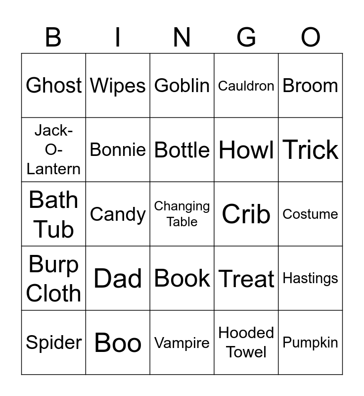 This bingo card has 40 words: Baby Powder, Bath Tub, Ben, Bonnie, Boo, Book, Bottle, Brew, Broom, Burp Cloth, Candy, Cauldron, Changing Table, Costume, Crib, Dad, Diaper, Ghost, Ghoul, Goblin, Hastings, Hooded Towel, Howl, Jack-O-Lantern, Lotion, Mom, Monster, Pacifier, Pumpkin, Rattle, Skeleton, Spider, Spooky, Treat, Trick, Vampire, Web, Willow, Wipes and Witch.