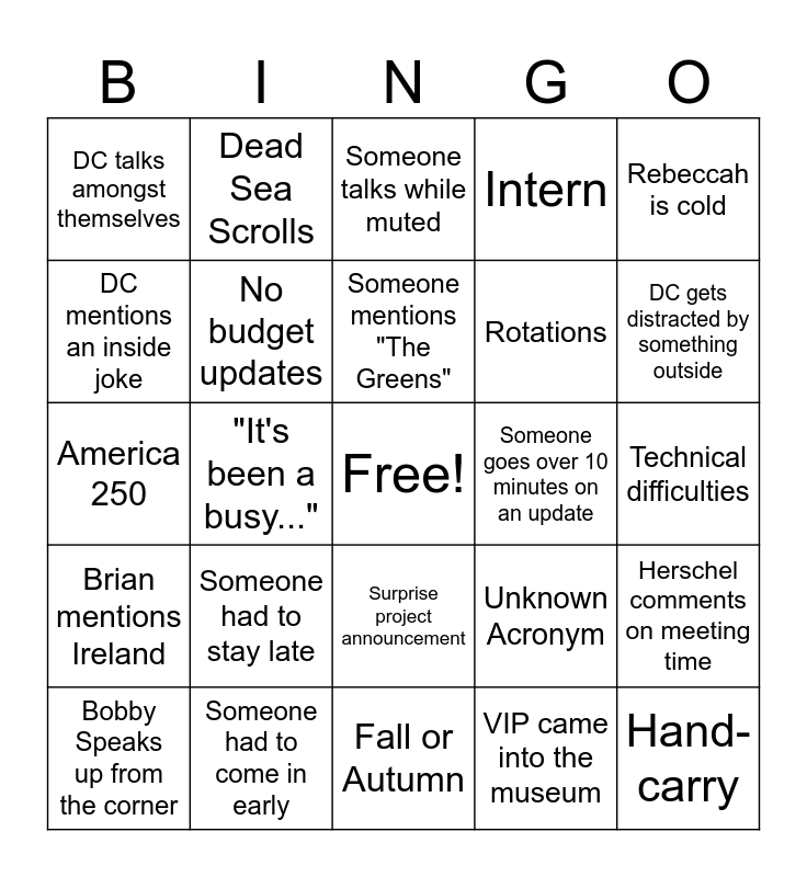 This bingo card has a free space and 24 words: Someone had to stay late, Someone had to come in early, Someone mentions "The Greens", Bobby Speaks up from the corner, Rebeccah is cold, DC talks amongst themselves, DC mentions an inside joke, Dead Sea Scrolls, Someone goes over 10 minutes on an update, Surprise project announcement, Rotations, America 250, Unknown Acronym, Herschel comments on meeting time, No budget updates, VIP came into the museum, Technical difficulties, Someone talks while muted, DC gets distracted by something outside, "It's been a busy...", Hand-carry, Brian mentions Ireland, Intern and Fall or Autumn.