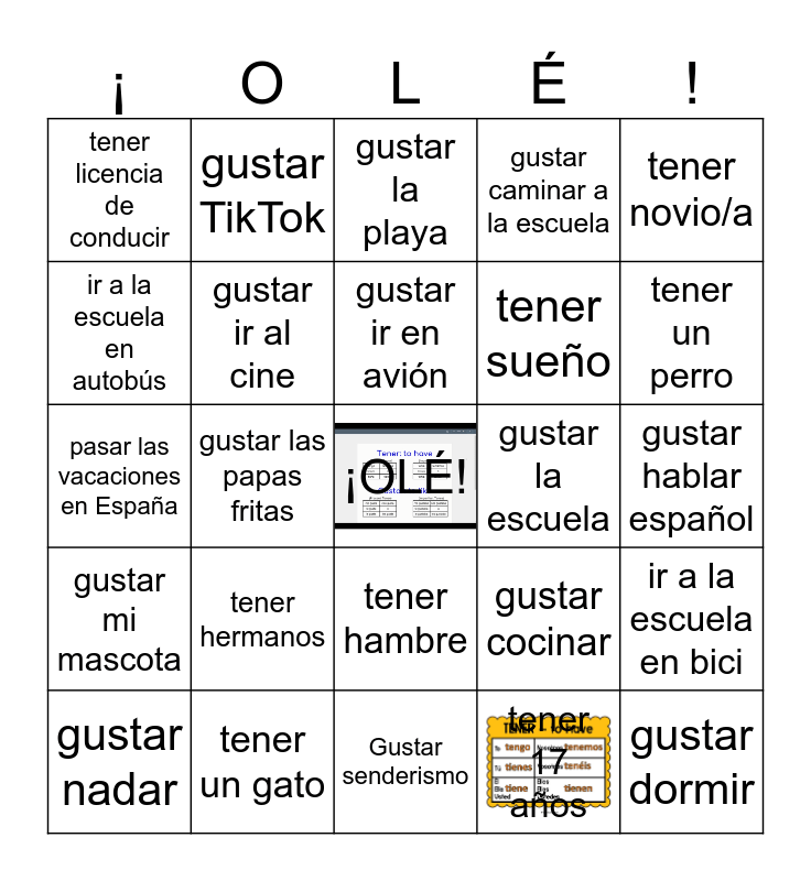 This bingo card has 1 images, a free space and 24 words: gustar nadar, tener hermanos, gustar ir en avión, tener 17 años, tener novio/a, tener licencia de conducir, gustar TikTok, gustar la playa, gustar la escuela, gustar hablar español, pasar las vacaciones en España, gustar ir al cine, gustar cocinar, ir a la escuela en bici, ir a la escuela en autobús, tener un gato, Gustar senderismo, gustar caminar a la escuela, tener un perro, gustar mi mascota, gustar las papas fritas, tener hambre, tener sueño and gustar dormir.