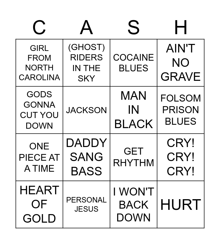This bingo card has 24 words: HIGHWAYMAN, I WALK THE LINE, FOLSOM PRISON BLUES, RING OF FIRE, GODS GONNA CUT YOU DOWN, GIRL FROM NORTH CAROLINA, JACKSON, (GHOST) RIDERS IN THE SKY, PERSONAL JESUS, IVE BEEN EVERYWHERE, ONE PIECE AT A TIME, GET RHYTHM, THE MAN COMES AROUND, ONE, MAN IN BLACK, AGAINST THE WIND, I WON'T BACK DOWN, COCAINE BLUES, DADDY SANG BASS, CRY! CRY! CRY!, HEART OF GOLD, HURT, AIN'T NO GRAVE and A BOY NAMED SUE.