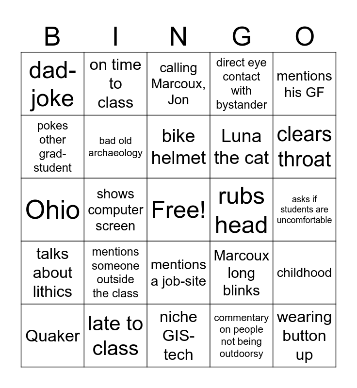 This bingo card has a free space and 28 words: childhood, capitalism, Luna the cat, commentary on people not being outdoorsy, pokes other grad-student, calling Marcoux, Jon, on time to class, talks about lithics, rubs head, Quaker, Ohio, direct eye contact with bystander, late to class, niche GIS-tech, clears throat, conversation with Marcoux, mentions someone outside the class, bad old archaeology, bike helmet, mentions a job-site, dad- joke, talking point question, wearing button up, shows computer screen, asks if students are uncomfortable, Marcoux long blinks, mentions his GF and checks in with students.