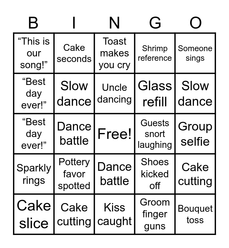 This bingo card has a free space and 44 words: Bride laughs, Bouquet toss, “This is our song!”, Cake slice, Group selfie, Groom finger guns, Toast makes you cry, Shoes kicked off, Someone sings, Cake cutting, Shrimp reference, Guests snort laughing, Dance battle, Pottery favor spotted, Guests scream-sing, Kiss caught, Uncle dancing, “Best day ever!”, Glass refill, Slow dance, Cake seconds, A drink spill, Bride laughs, “This is our song!”, Cake slice, Group selfie, Groom finger guns, Toast makes you cry, Shoes kicked off, Sparkly rings, Someone sings, Cake cutting, Shrimp reference, Guests snort laughing, Dance battle, Pottery favor spotted, Guests scream-sing, Kiss caught, Uncle dancing, “Best day ever!”, Glass refill, Flowers fall, Slow dance and Cake seconds.
