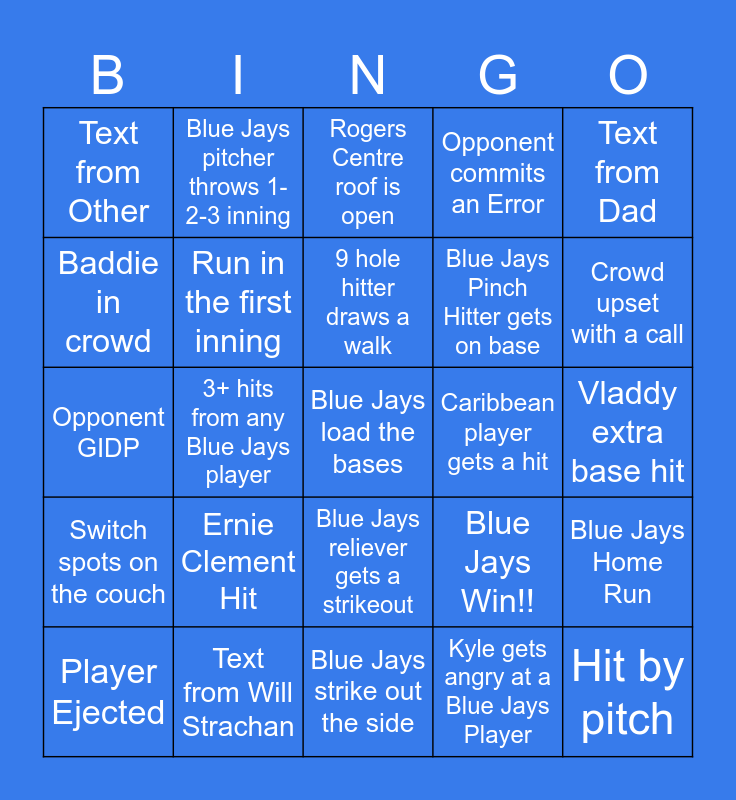 This bingo card has 25 words: Ernie Clement Hit, Blue Jays strike out the side, 9 hole hitter draws a walk, Player Ejected, Text from Dad, Text from Other, Baddie in crowd, Blue Jays pitcher throws 1-2-3 inning, Caribbean player gets a hit, Blue Jays reliever gets a strikeout, Blue Jays Pinch Hitter gets on base, Opponent GIDP, Blue Jays Win!!, Blue Jays Home Run, Run in the first inning, Hit by pitch, Vladdy extra base hit, Rogers Centre roof is open, Crowd upset with a call, 3+ hits from any Blue Jays player, Blue Jays load the bases, Text from Will Strachan, Switch spots on the couch, Opponent commits an Error and Kyle gets angry at a Blue Jays Player.