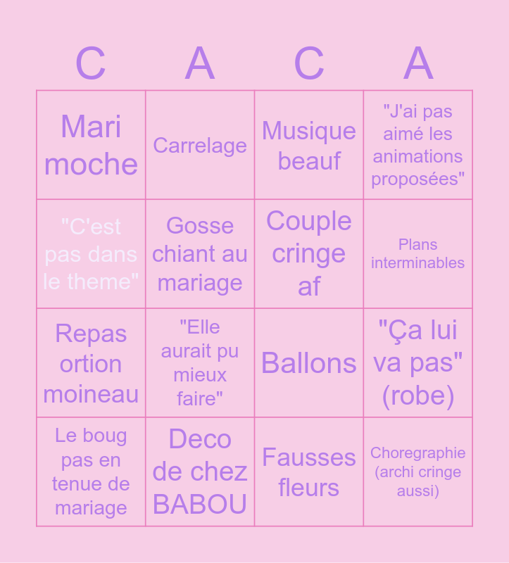 This bingo card has 16 words: Deco de chez BABOU, "Ça lui va pas" (robe), Musique beauf, Mari moche, Repas ortion moineau, Carrelage, Ballons, Fausses fleurs, "C'est pas dans le theme", Gosse chiant au mariage, Le boug pas en tenue de mariage, "J'ai pas aimé les animations proposées", "Elle aurait pu mieux faire", Plans interminables, Couple cringe af and Choregraphie (archi cringe aussi).