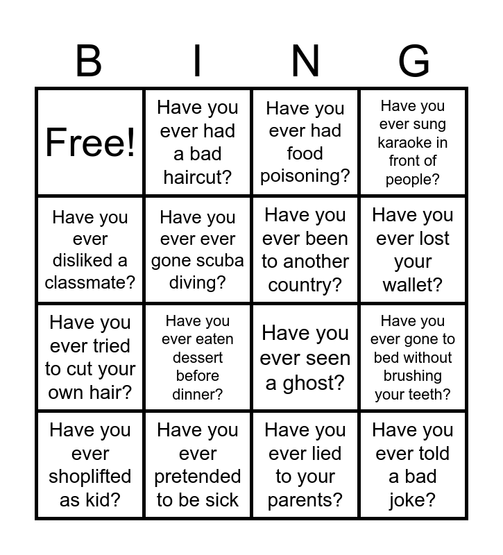 This bingo card has 21 words: Have you ever shoplifted as kid?, Have you ever called a teacher mom?, Have you ever been to another country?, Have you ever gone to bed without brushing your teeth?, Have you ever gotten in trouble in school?, Have you ever had a bad haircut?, Have you ever had food poisoning?, Have you ever sung karaoke in front of people?, Free!, Have you ever ever gone scuba diving?, Have you ever cried in a movie?, Have you ever lost your wallet?, Have you ever skipped school?, Have you ever pretended to be sick, Have you ever lied to your parents?, Have you ever told a bad joke?, Have you ever tried to cut your own hair?, Have you ever eaten dessert before dinner?, Have you ever seen a ghost?, Have you ever disliked a classmate? and Have you ever lied about your age?.